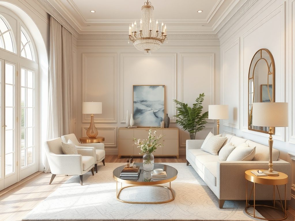 Używaj metalicznych elementów w lampach, uchwytach i dekoracjach, ale z umiarem, aby nie przesadzić z ich ilością. Stosuj zasady symetrii, umieszczając meble i dodatki w pary, takie jak lampki nocne czy świeczniki. Zrównoważ różnorodność faktur, łącząc gładkie powierzchnie z miękkimi materiałami.